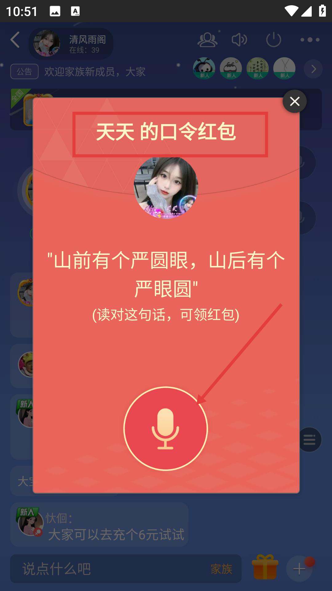 4、進入家族紅包領取環節后,看到口令紅包界面,按照要求點擊麥克風圖標,讀出紅包口令,完成紅包領取操作。