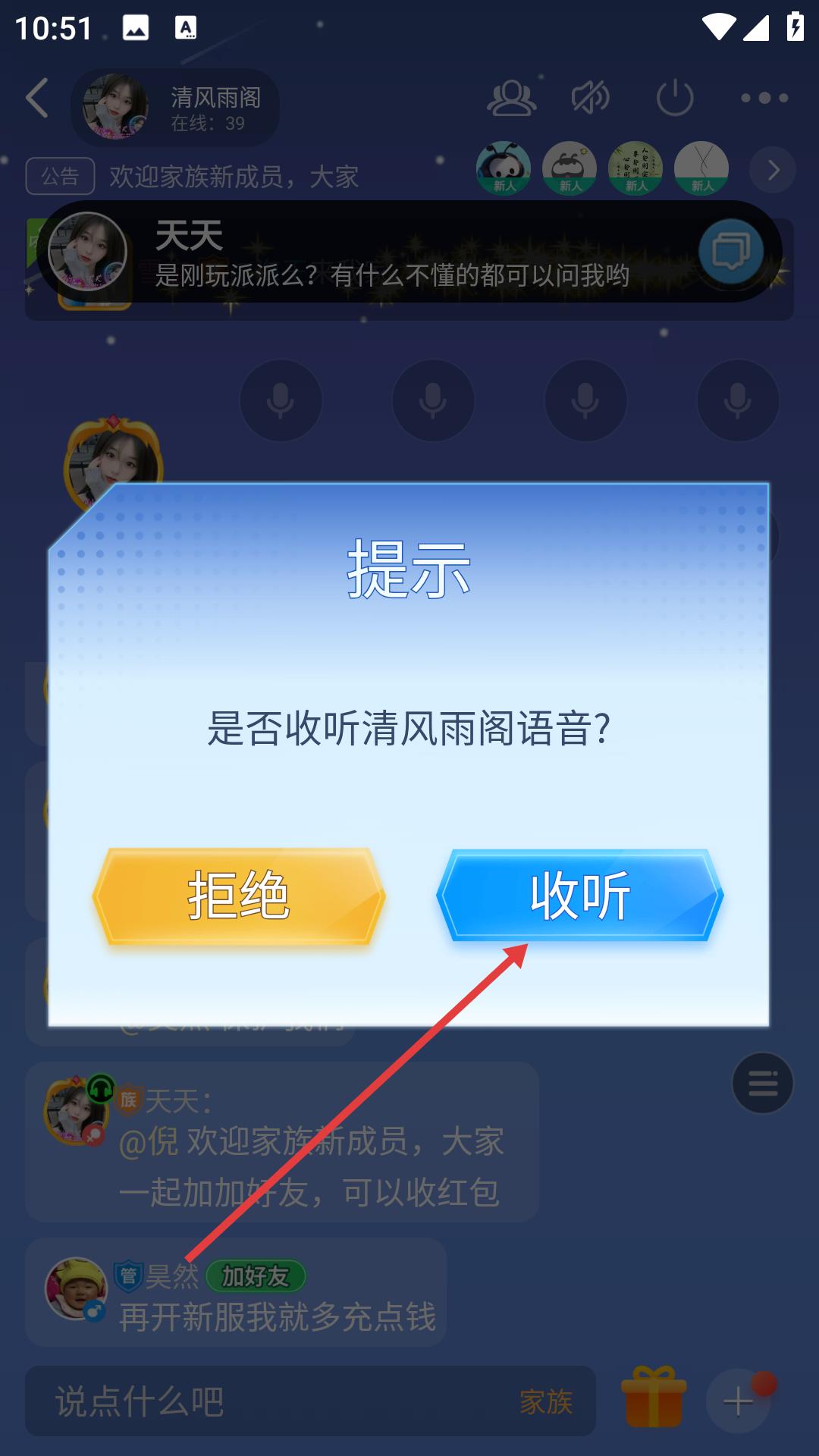 2、加入家族后彈出是否收聽家族語音的提示框,點擊收聽按鈕,進入家族語音交流場景。