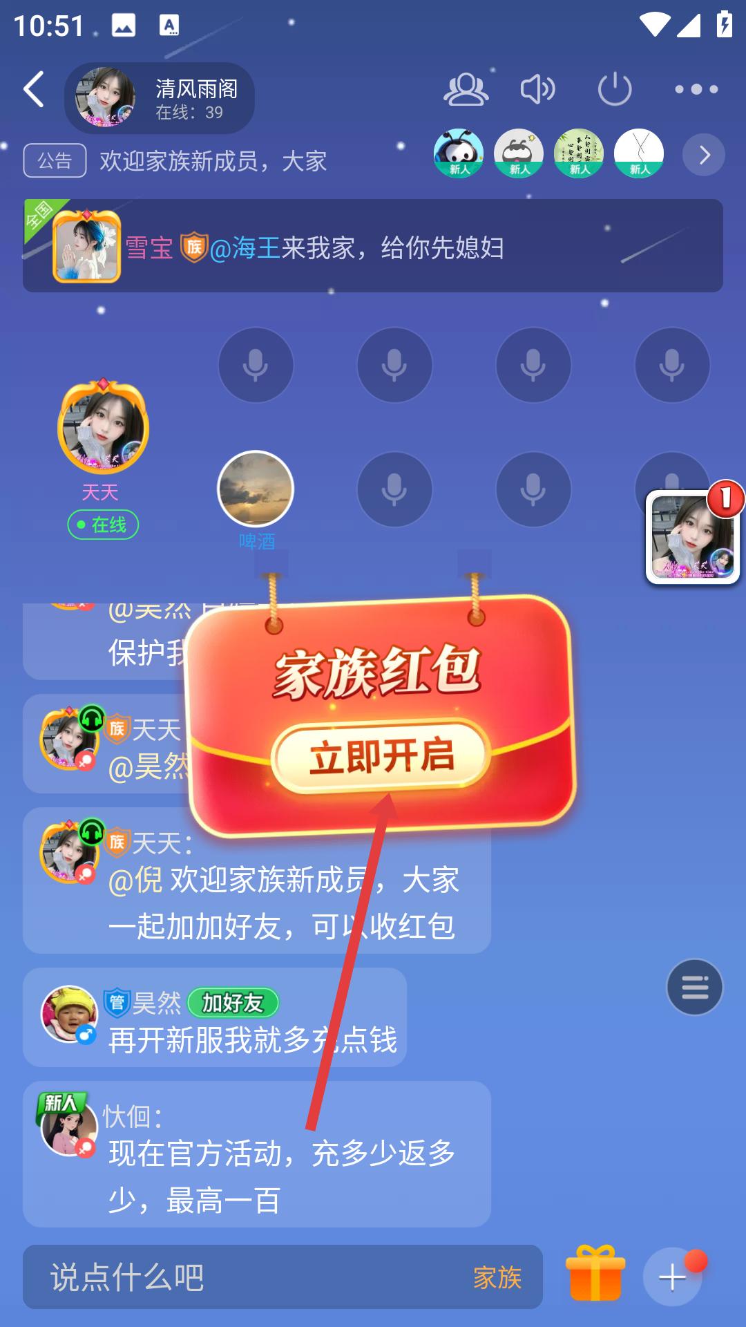 3、在家族交流場景中看到家族紅包,立即開啟的提示,點擊該提示,進入家族紅包領取環節。