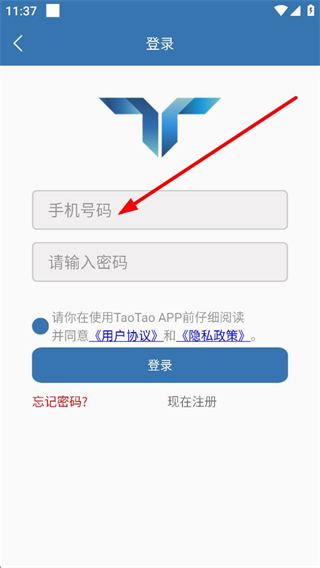 2、登錄界面,輸入手機號碼和密碼,勾選用戶協議和隱私政策后點擊登錄,若忘記密碼可點擊忘記密碼進行找回,也可選擇注冊新賬號。