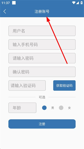 3、注冊賬號界面,需填寫用戶名、手機號碼、密碼、確認密碼,獲取并輸入驗證碼,還可選擇填寫年齡和性別,填寫完成后點擊注冊,完成賬號創建。