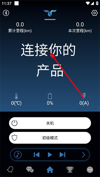 4、進入產品連接界面,可查看累計里程、本次里程、溫度、電量、電流等數據,有關機、初級模式等功能選項,還有音樂控制功能。