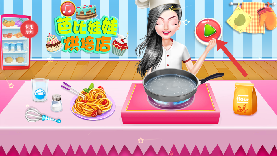 1、進入游戲,點擊開始按鈕,開啟芭比娃娃烘焙店的美食制作之旅,準備制作美味面食。