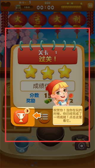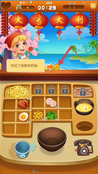3、完成美食制作并提供給顧客后,要記得收取金幣,及時點擊出現的金幣圖標,可以獲取相應的收益,逐步完成關卡目標。