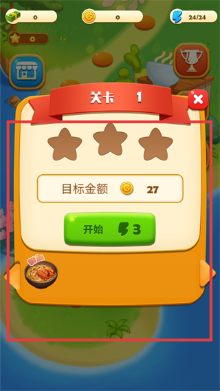 1、例如進入關卡1,關卡1目標金額為27金幣,需消耗3點閃電能量開始,準備好后點擊綠色開始按鈕,即可開啟制作美食的挑戰。