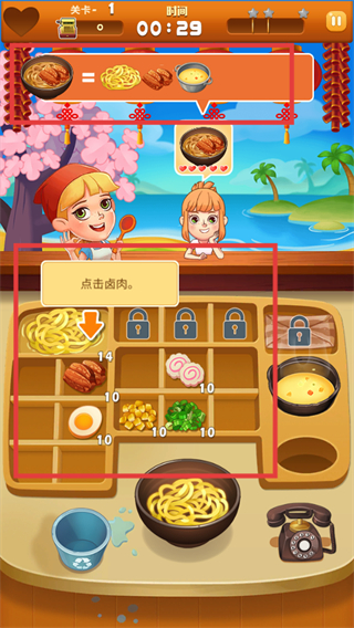 2、進入經營場景后,顧客需要一碗包含面條、鹵肉和湯的美食,按照提示先展現所需食材,為制作美食選取食材。