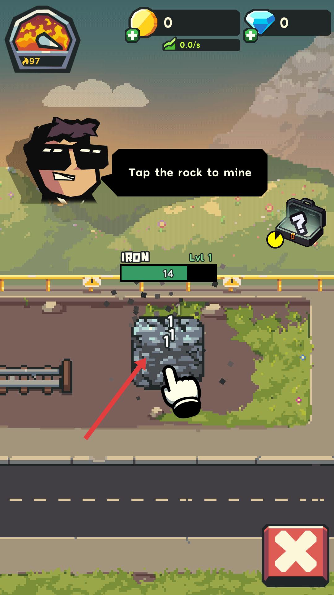 1、進入游戲后,按照提示點擊巖石,進行采礦操作,隨著點擊,能看到巖石的進度條在變化。