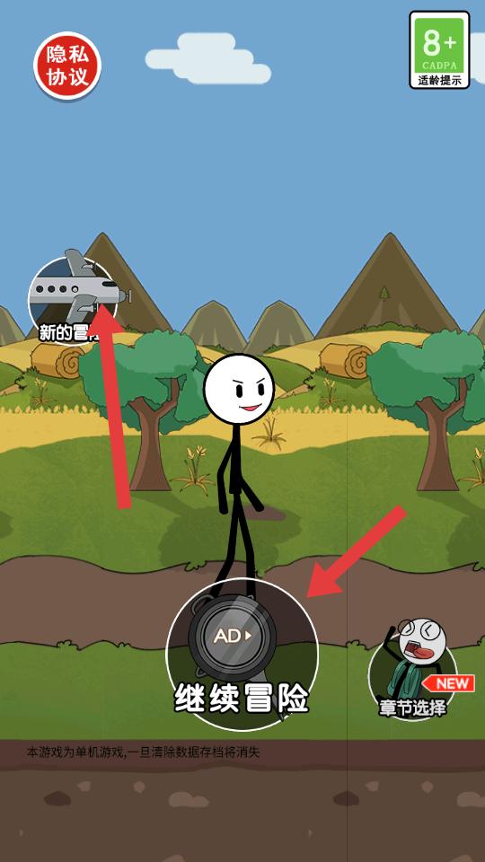 1、進入游戲,能看到火柴人站到野外場景中,有繼續冒險,章節選擇等選項,點擊繼續冒險,開啟冒險旅程。