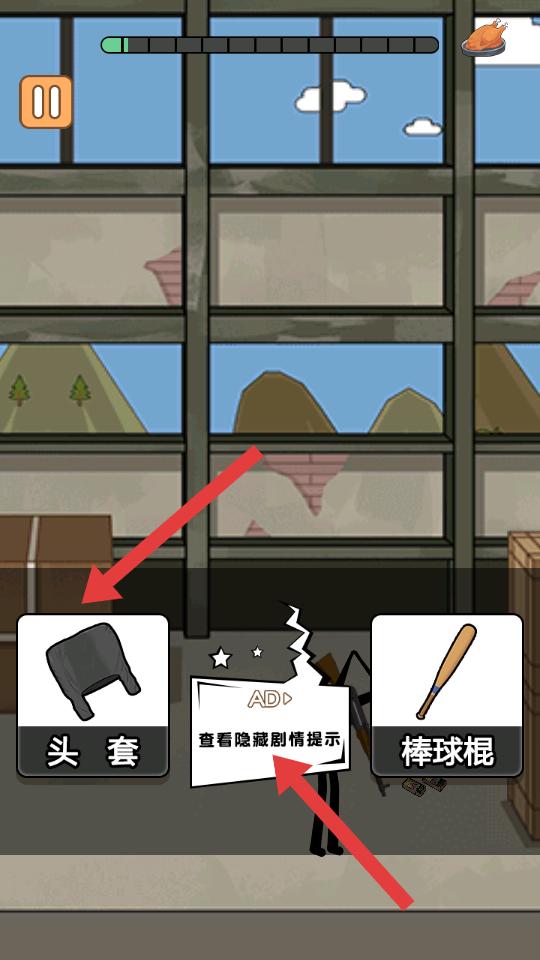 2、冒險過程中,會遇到不同場景,在室內場景時,會出現頭套,棒球棍等道具選擇,也可查看隱藏劇情提示,選擇道具推進冒險。