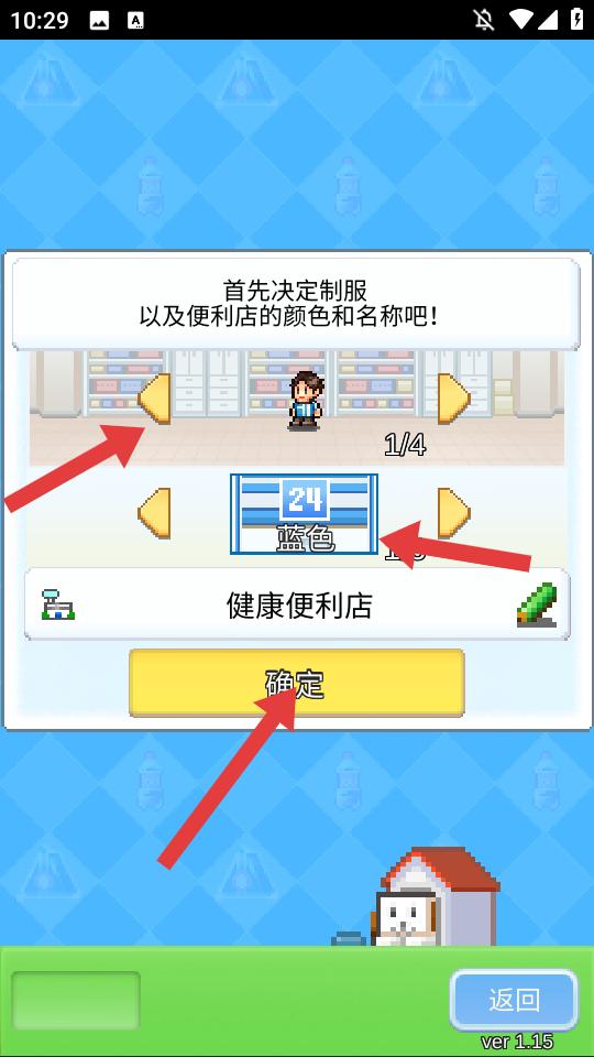 2、開始游戲后,需決定制服,便利店顏色和名稱,選擇好后點擊確定,完成便利店的初步設定。