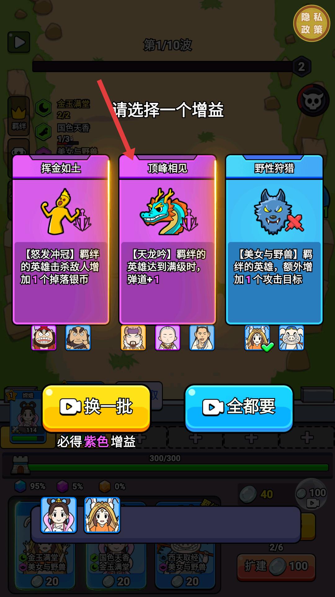 3、戰斗過程中,會出現增益選擇界面,可挑選揮金如土、頂峰相見等增益效果,增強己方戰力。