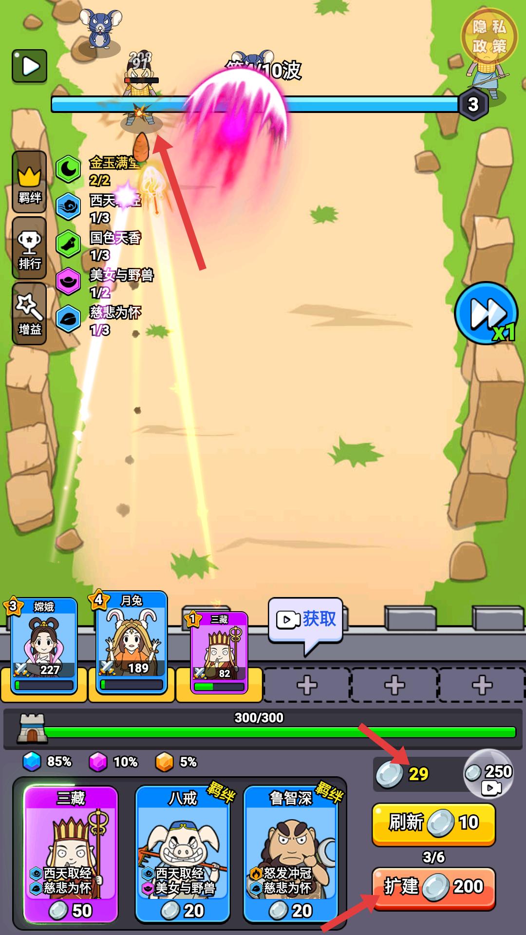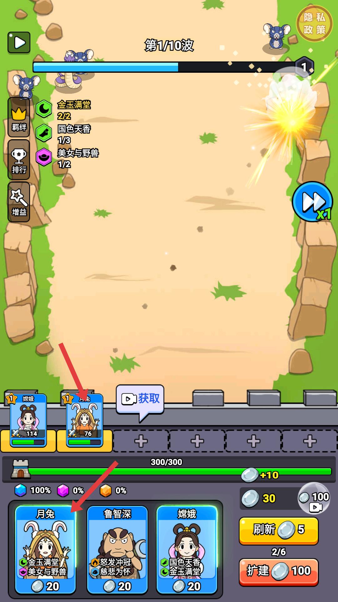 2、游戲中可選擇嫦娥、月兔等角色放置在城墻處,利用他們的能力攻擊來襲的敵人,抵御敵人進攻。