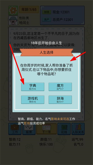 2、周歲時會出現人生選擇界面,可從字典、魔方、游戲機、辭海里選一個物品,不同物品對應增加不同屬性,比如字典能加能力6。