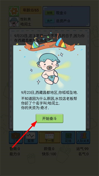 1、會看到角色出生信息,包含年齡性別名字等,天資顯示為奇才,點擊開始奮斗按鈕,即可開啟你的人生模擬之旅。