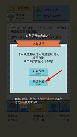 3、后續每年會出現新的人生選擇,比如可選擇懸梁刺股,該選項能增加智商屬性,不同選擇會影響角色對應的屬性數值。