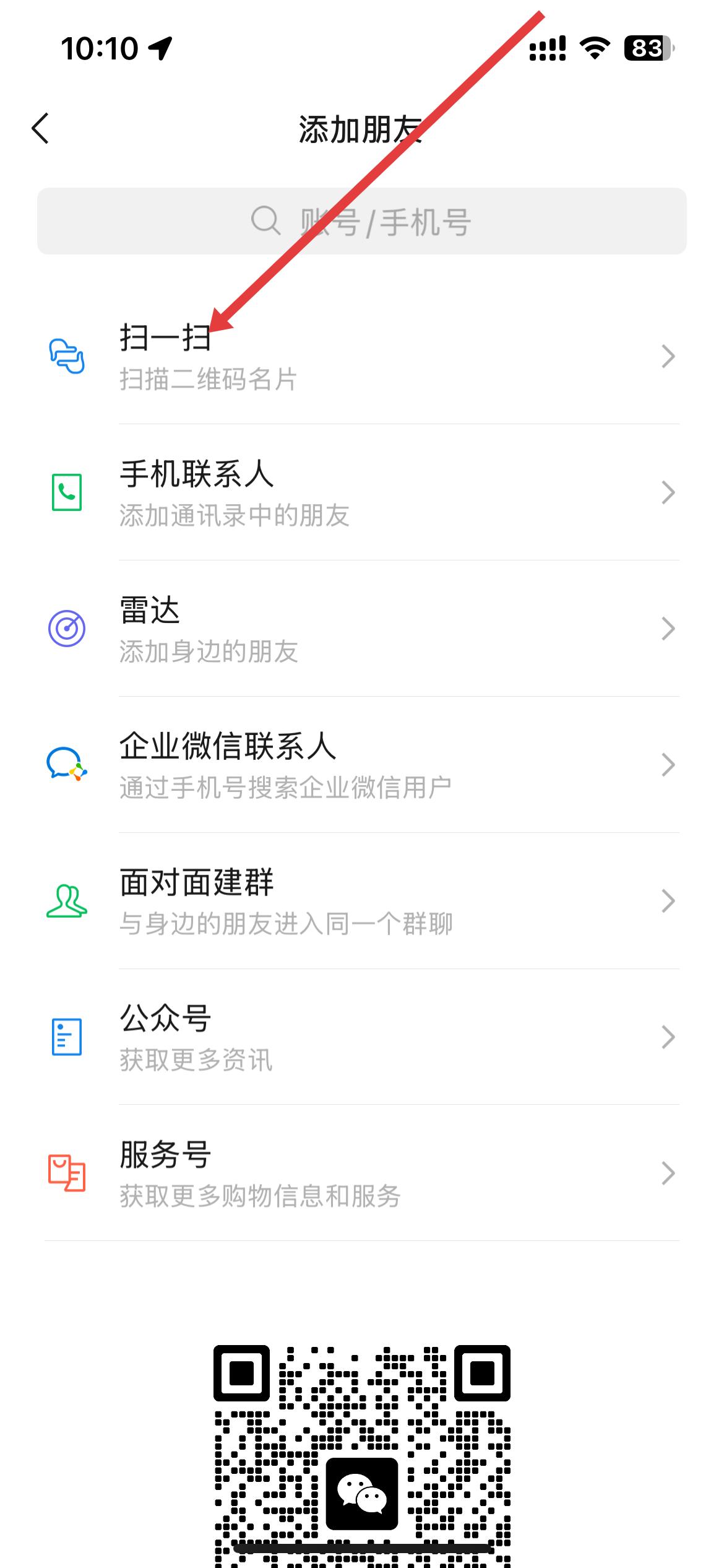 3、添加朋友頁面,有賬號、手機號搜索欄,點擊掃一掃選項,進入掃碼界面。