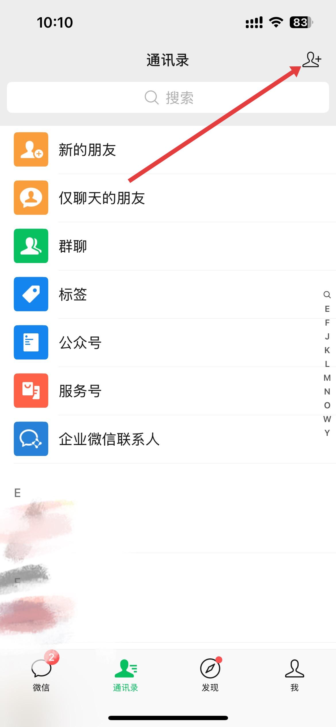 2、通訊錄界面,有新的朋友、群聊等分類,點擊右上角添加好友圖標,進入添加朋友頁面。