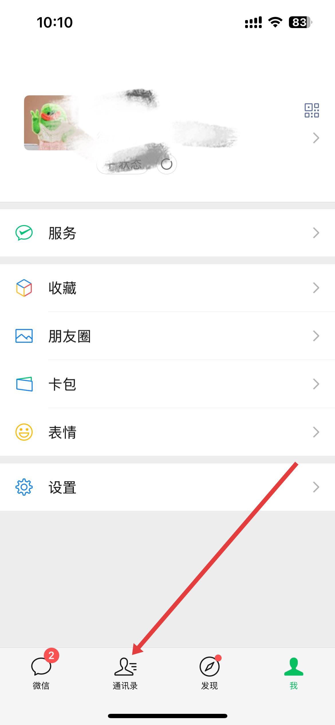 1、打開微信,個人頁面能看到服務、收藏等選項,點擊下方通訊錄,進入通訊錄界面。
