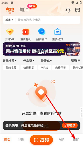 1、進入快電首頁,可見搜索欄及開通VIP邀請有禮等功能入口,點擊我的可進入個人中心,開啟定位還能查看附近電站。