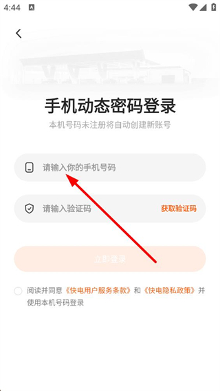 3、進入手機動態密碼登錄界面,需輸入手機號碼,點擊獲取驗證碼并填寫,勾選相關條款后完成登錄,未注冊會自動創建賬號。