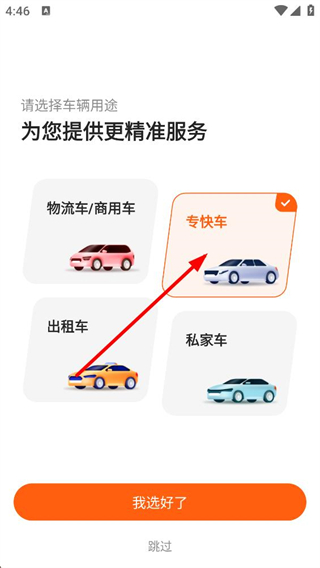 4、登錄后出現車輛用途選擇界面,可選物流車??燔嚨阮愋停x好后點擊我選好了,也可直接跳過該步驟繼續使用。