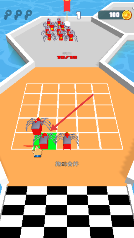 2、進入方格區域后,按照提示拖動相同的蜘蛛角色進行合并,合并后能得到更強大的單位,助力后續與敵方戰斗。