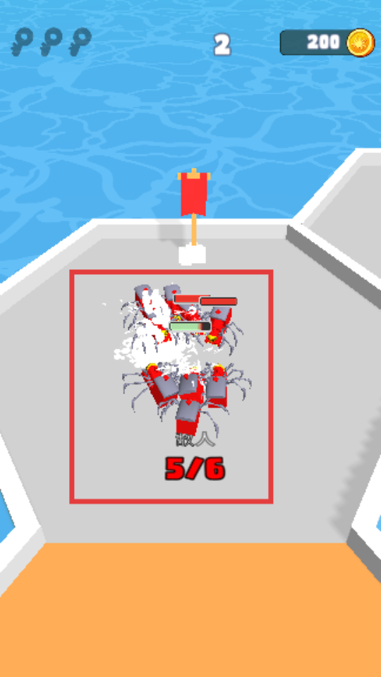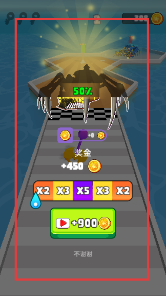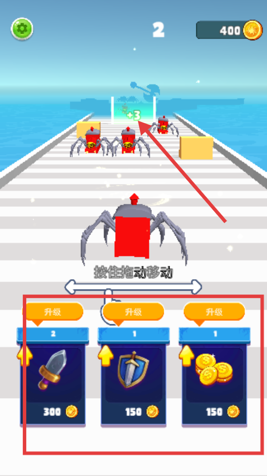 1、按住拖動角色移動,要盡量讓角色吃到帶有增益道具前,同時可花費金幣升級武器、防御和金幣獲取能力,提升戰力與收益。