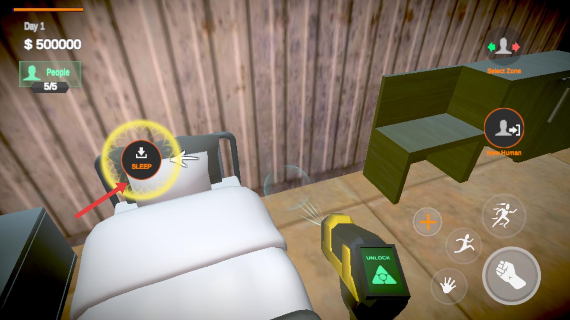 4、當人員安置等任務完成后,進入室內場景,看到帶有SLEEP標識的床,點擊該標識,可讓角色休息,恢復狀態,為后續行動做好準備。