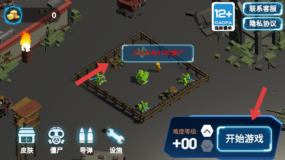 1、進入游戲,能看到有僵尸和機槍的場景,界面提示點擊機槍打敗僵尸,調整難度等級后,點擊開始游戲,開啟防御僵尸的戰斗。