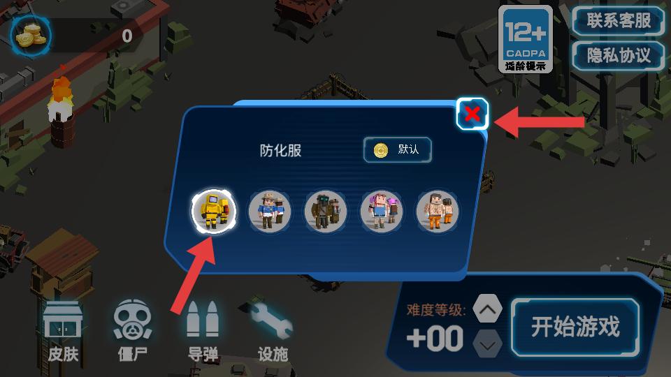 2、在皮膚界面,可選擇不同的防化服,選好后關閉界面,就能帶著所選皮膚進入游戲,參與僵尸防御。