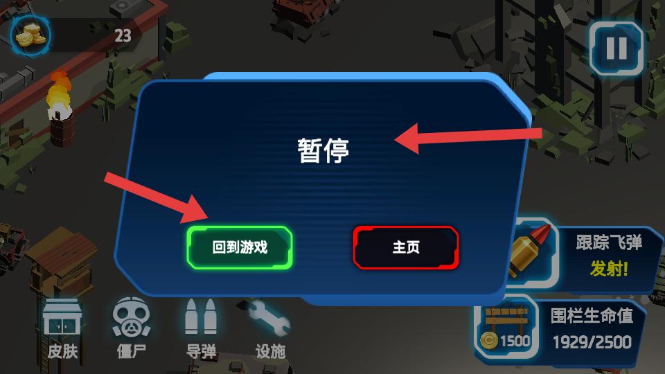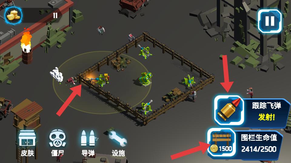 3、游戲中,僵尸會攻擊圍欄,要關注圍欄生命值,還能使用跟蹤飛彈攻擊僵尸,阻止它們破壞圍欄,守護陣地。