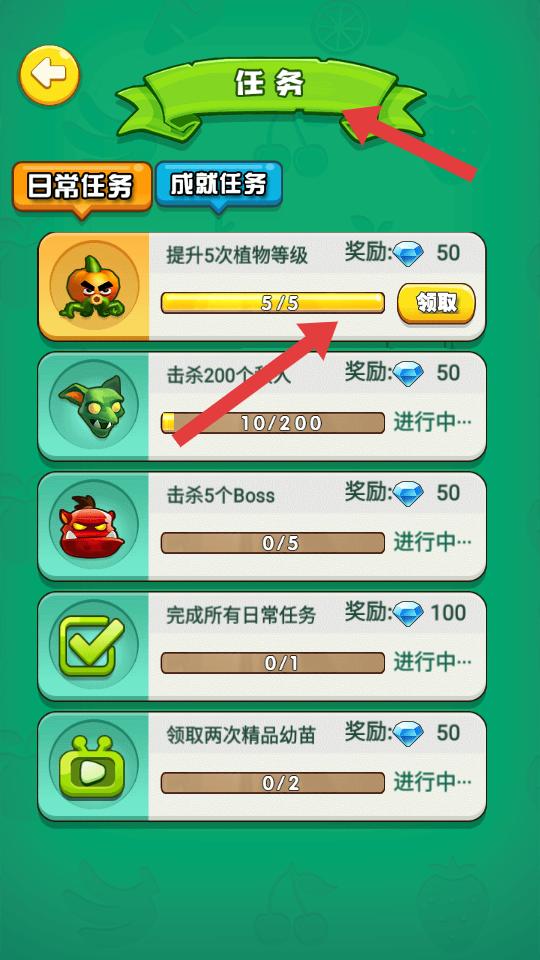 2、在任務界面,有日常任務和成就任務,完成提升植物等級,擊殺敵人等任務,可領取鉆石等獎勵,助力游戲進程。