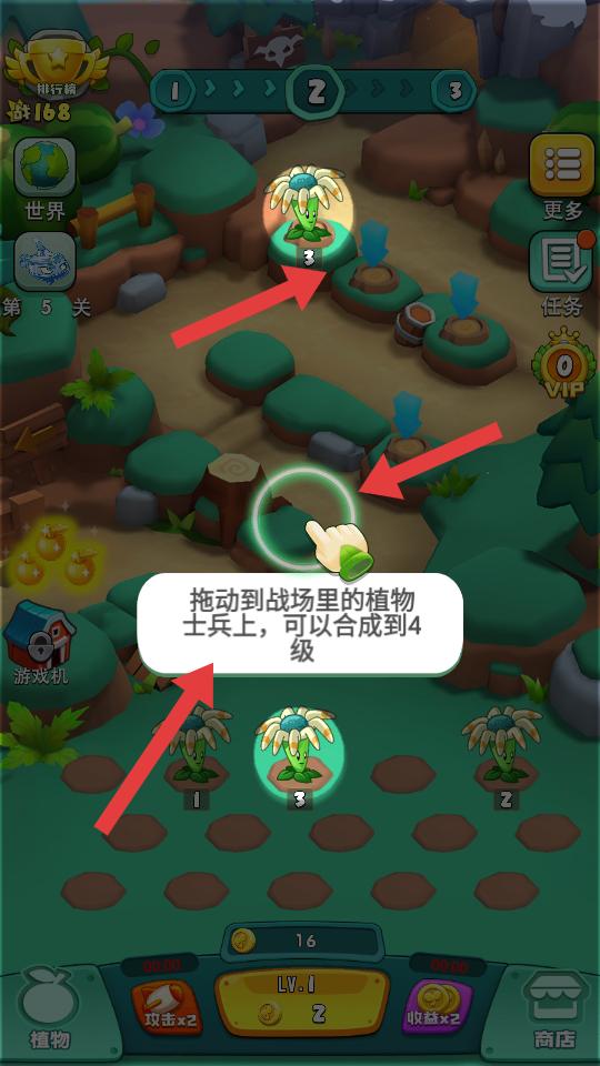 4、玩家可拖動植物到戰場里的植物士兵上,進行合成,能將植物合成到4級,提升植物戰斗力,更好地抵御敵人。