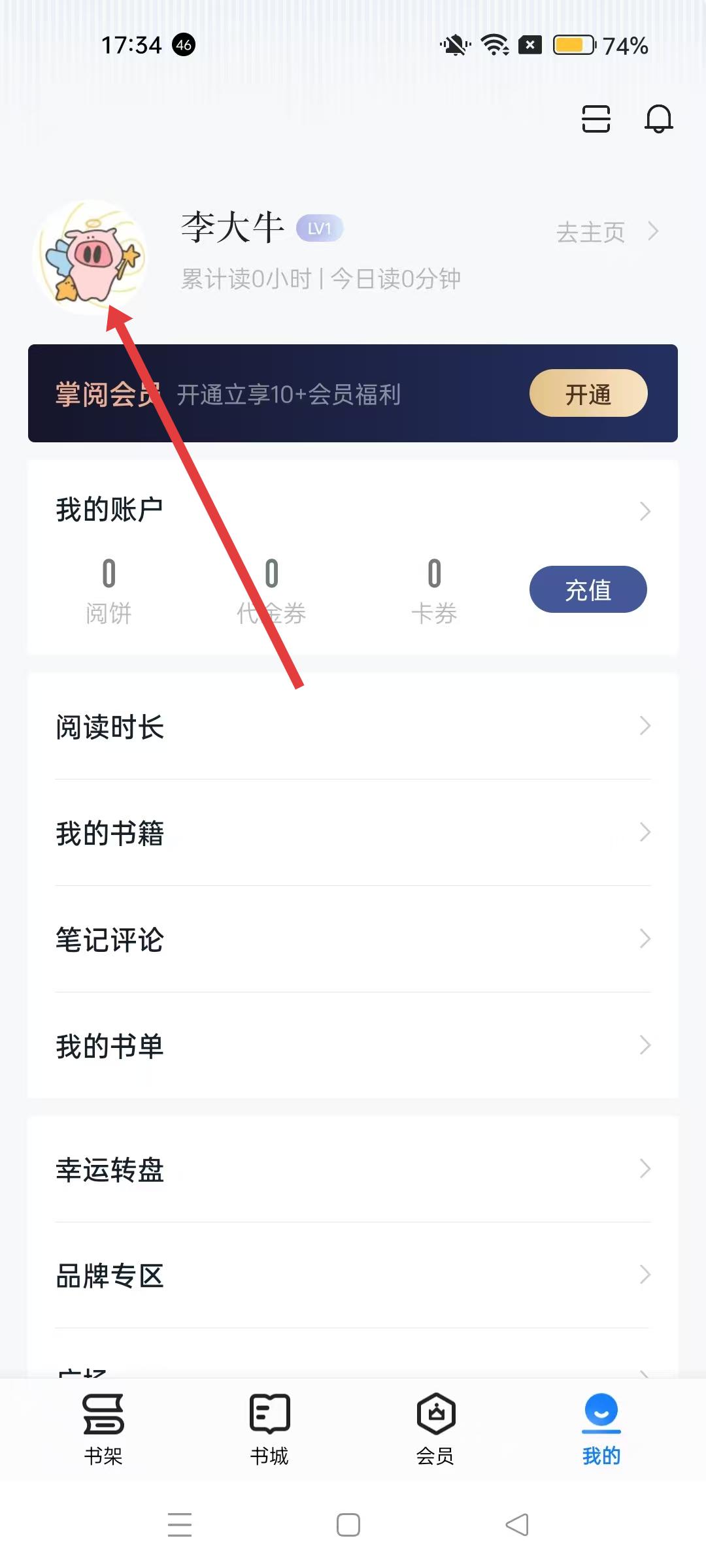 4、登錄后進入我的界面,可查看用戶信息,如閱讀時長、我的書籍、筆記評論等,還有掌閱會員開通入口,開通后可享受多項會員福利。