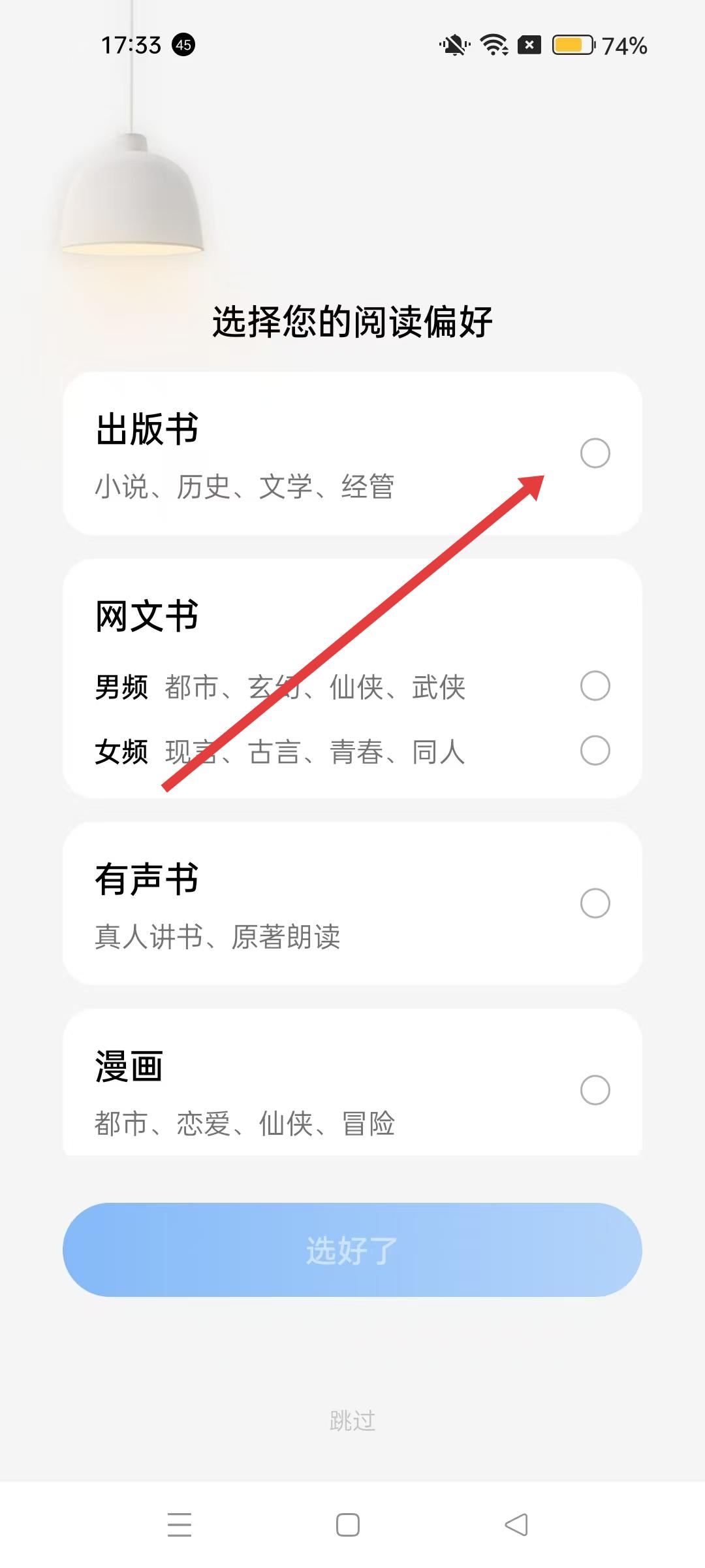 1、打開掌閱APP,首先進入閱讀偏好選擇界面,可選擇出版書、網文書、有聲書、漫畫等不同類型,選擇后可定制個性化推薦。