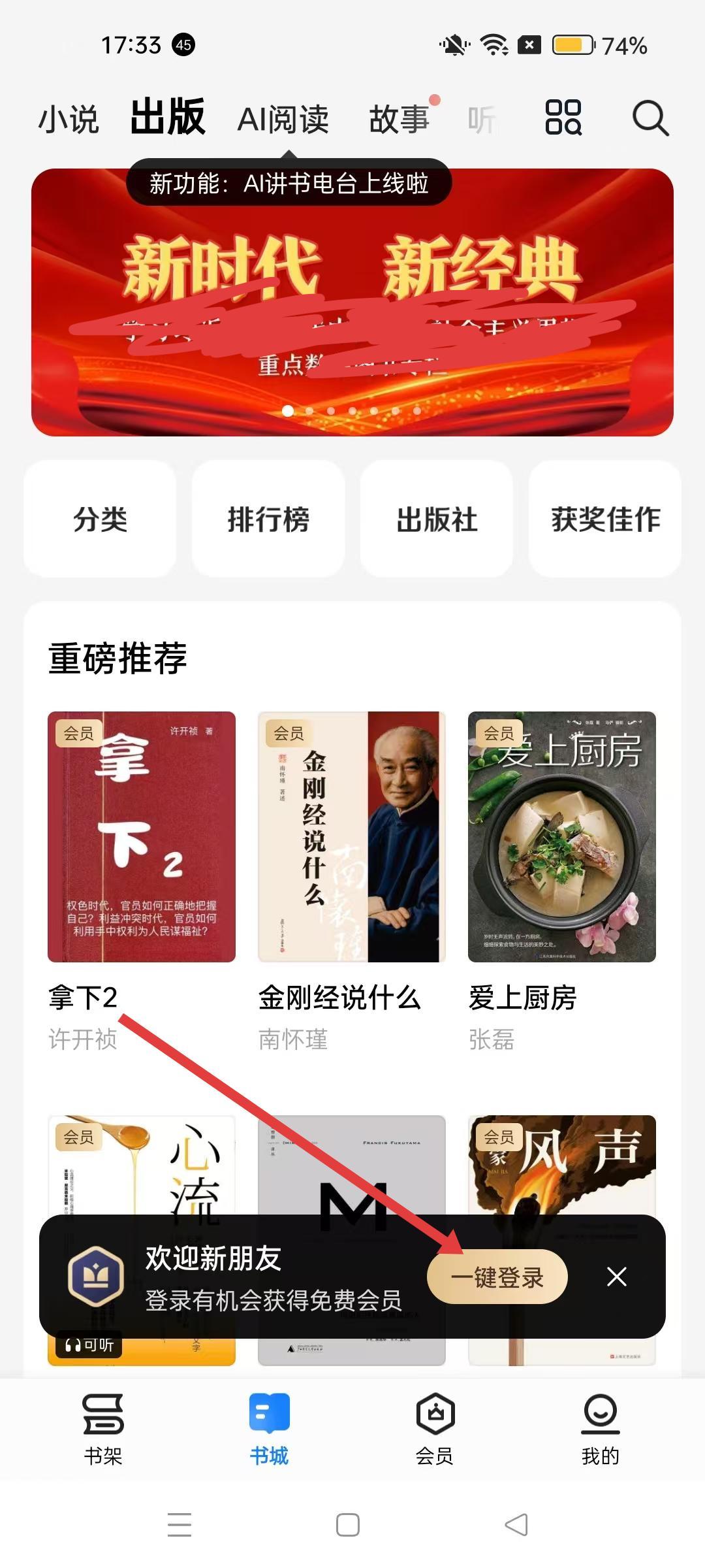 2、進入書城界面,有小說、出版、AI閱讀等分類,展示重磅推薦書籍,還有一鍵登錄入口,登錄后有機會獲得免費會員。