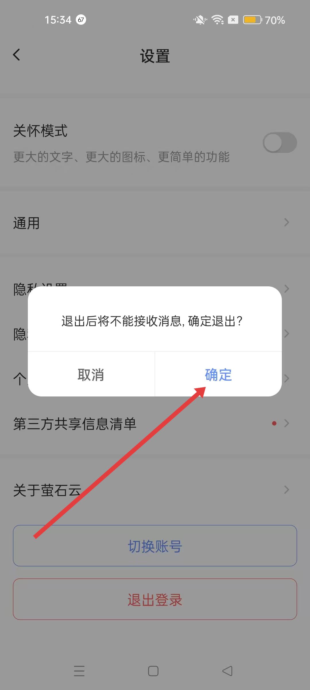 3、設置頁面,找到退出登錄按鈕,點擊它彈出退出確認窗口,詢問是否確定退出。