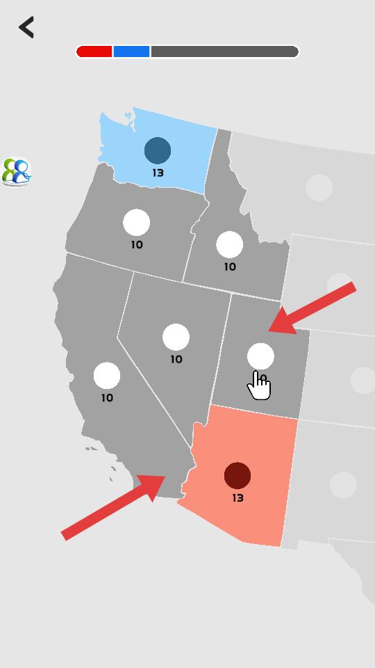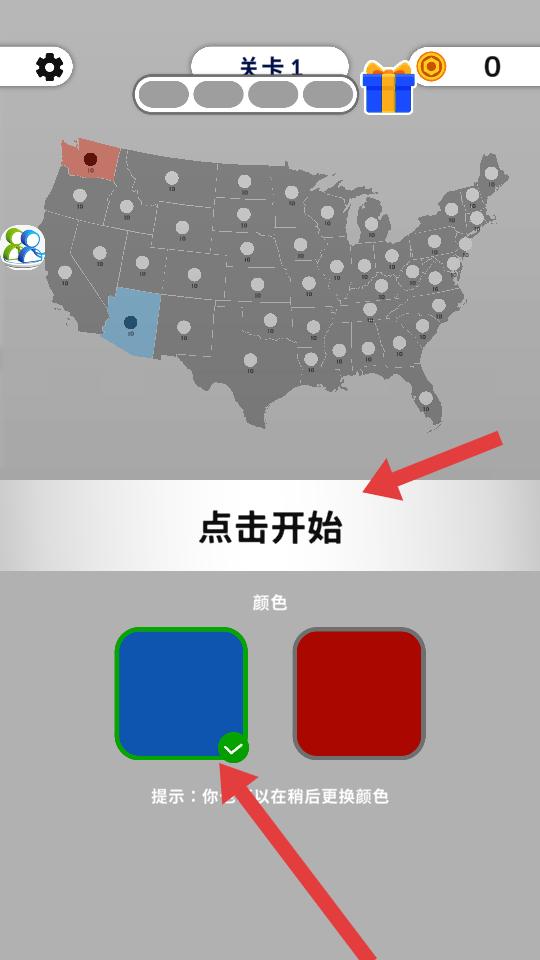 1、進入游戲,選擇顏色后點擊開始,開啟關卡挑戰,此時地圖上有不同區域,需通過策略去爭奪。