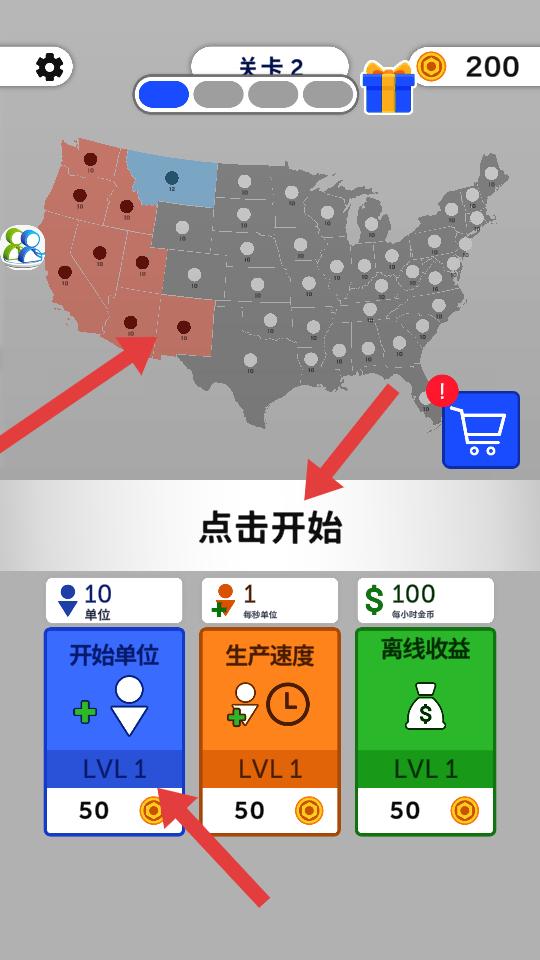 2、關卡中可升級開始單位,生產速度,離線收益等,提升自身實力,助力在領土爭奪里占據優勢。