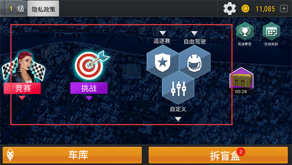 1、游戲主界面有競賽、挑戰等多種模式,還有追逐賽、自由駕駛等玩法,可根據喜好選擇,同時能查看金幣數量和在線獎勵等。