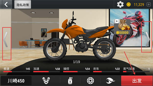2、車庫里可查看不同摩托車,像川崎450能了解其極速、加速等屬性,還能通過箭頭切換摩托,選好后點擊出發進入游戲。