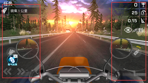 4、游戲過程中左側顯示任務和氮氣等功能,右側能看到速度、騎行公里數等信息,要專注騎行完成任務目標。