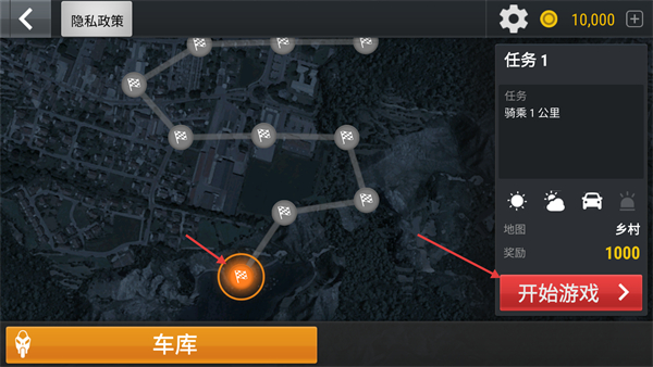 3、地圖界面會顯示任務,比如騎乘1公里獲得獎勵,選擇要進行的任務點,點擊開始游戲即可開啟對應騎行任務。