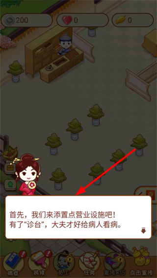 1、游戲開局需添置營業設施,先設置診臺,有了診臺大夫才能給病人看病,開啟醫館經營之路。