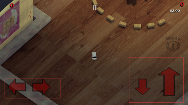 3、玩家通過屏幕左下角的左右方向虛擬按鈕控制玩具車轉向,屏幕右下角的上下方向虛擬按鈕控制前進和后退,以此來操控玩具車。