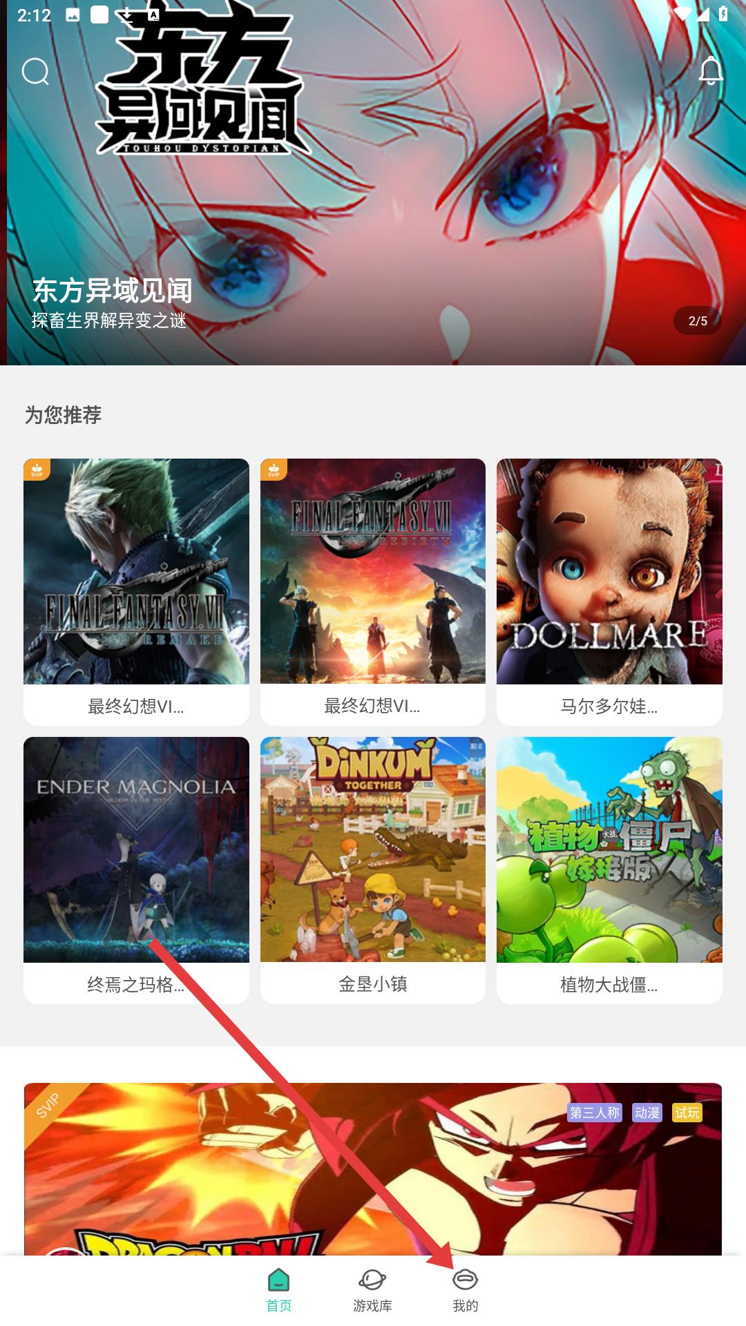 1、進入游戲平臺首頁,可看到推薦游戲如最終幻想VII、馬爾多爾娃等,點擊底部我的進入個人界面。