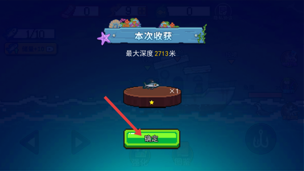 2、釣到魚后,會顯示本次收獲界面,展示釣到的魚以及最大釣魚深度等信息,點擊確定確認收獲。
