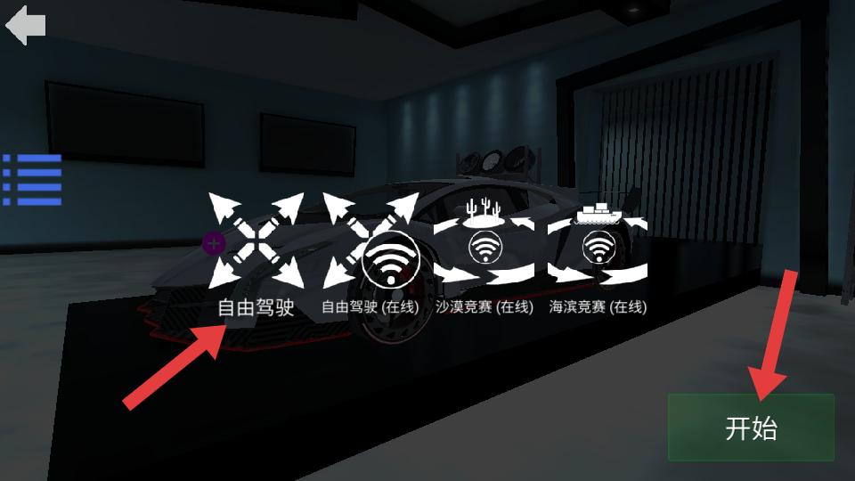2、在模式選擇界面,有自由駕駛,沙漠競賽等多種模式可選,選好后點擊開始,進入駕駛場景。