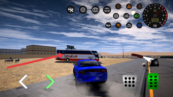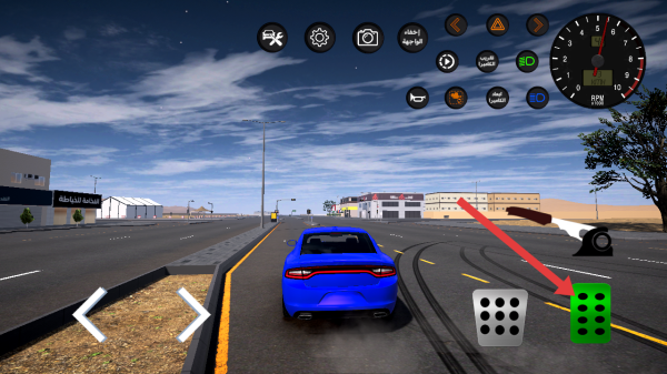 3、駕駛藍色車輛道路上行駛,界面有油門等操控按鈕,還有儀表盤等顯示車輛狀態,可操控車輛加速前進。