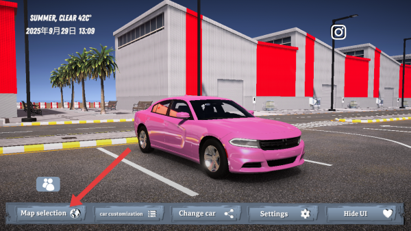 1、進入游戲,可看到停著的粉色車輛,界面有開始功能按鈕,能選擇地圖、定制車輛等,開啟駕駛準備。